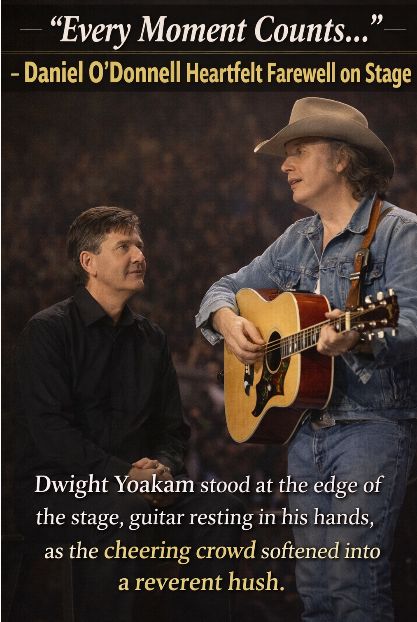 That is the emotional weight behind “Every Moment Counts…” — Daniel O’Donnell Heartfelt Farewell on Stage. Dwight Yoakam stood at the edge of the stage, guitar resting in his hands, as the cheering crowd softened into a reverent hush. Even if you’ve spent your life around music, there’s something arresting about a stage going quiet—not because the audience is bored, but because they’re moved. Silence like that isn’t empty. It’s respect. It’s recognition. It’s the sound of people realizing they’re witnessing something they won’t be able to replay in their own lives, no matter how many times they stream the song later.