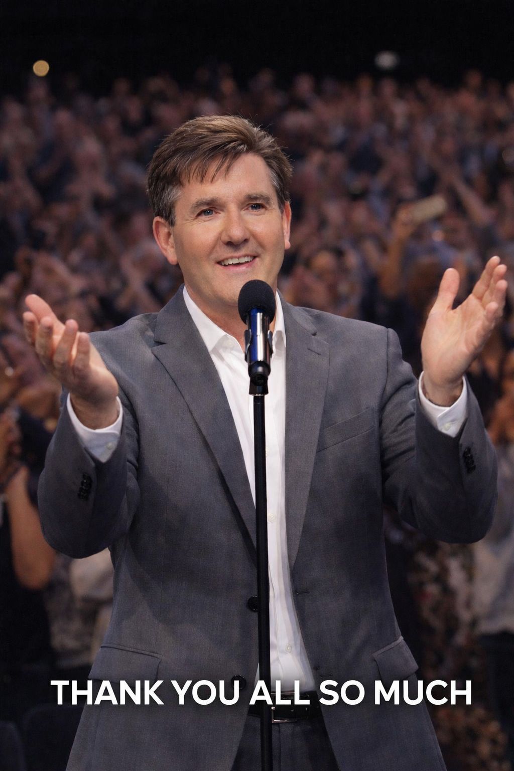 A hush spreads through the venue—slow, almost respectful—like everyone instinctively understands this is not a night for shouting over the music or rushing the moment. Daniel O’Donnell steps forward with the familiar gentle posture, the same steady presence that has carried his songs through decades of living rooms, hospital rooms, long drives, and quiet prayers. He reaches the microphone, but he doesn’t sing right away.